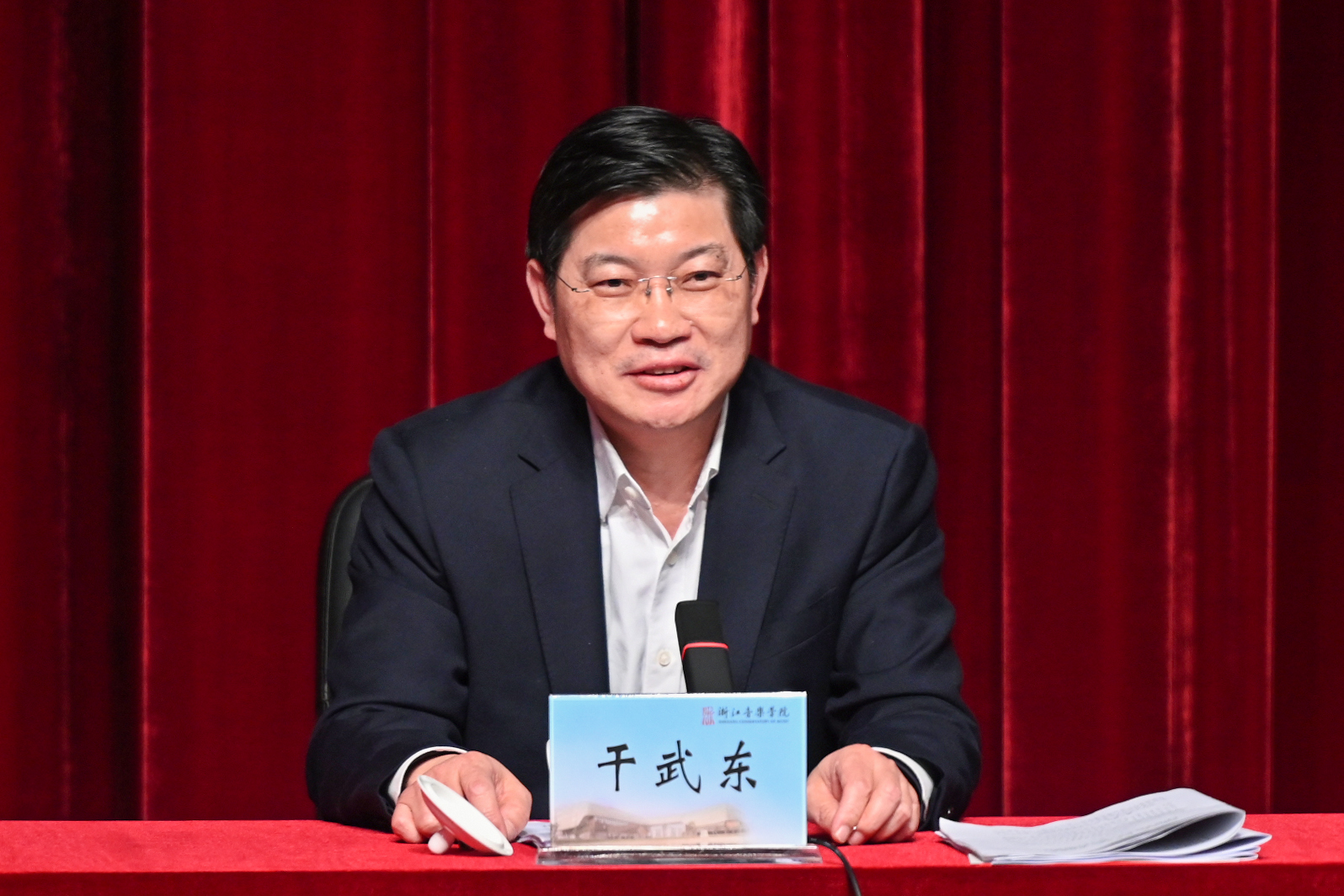 党委书记干武东在大会上作题为“深化改革 大胆创新 主动开放 全面构筑'高水平一流'发展新优势”的讲话。他简要通报了过去一年学院所取得的重大办学成果与办学成绩,以及新年以来频频传来的喜讯捷报,对过去一年全体教职工的默默耕耘和辛勤付出表示了崇高的敬意和由衷的感谢。他指出,2023年是充满想象和期待的一年,也是学院继续勇毅前行、奋力赶超、大步跨越的一年,各项工作的主基调就是以改革谋发展、以创新求突破、以开放促提升,全面推进学院全方位的攀升、晋升、飙升和跃升,以更高质量、更具显现度的标志性成果交出浙音的高分报表。