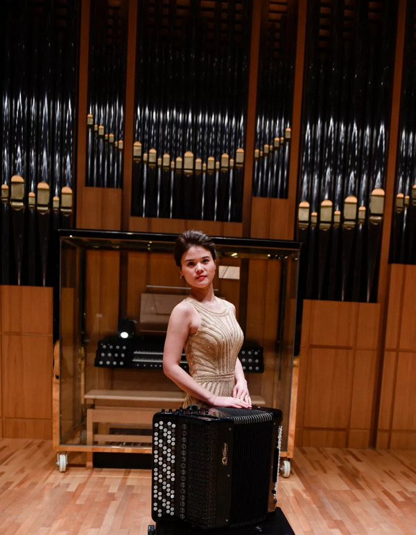 流行音乐系青年教师吴雯怡怀抱巴扬,十指跃动,左臂轻舒拉动风箱,脸露优雅自信的笑容。柔缓的弦乐烘托着巴扬流动的旋律,而巴扬的独特音色映衬着歌手的深情婉唱,珠联璧合,将此曲娓娓道来。