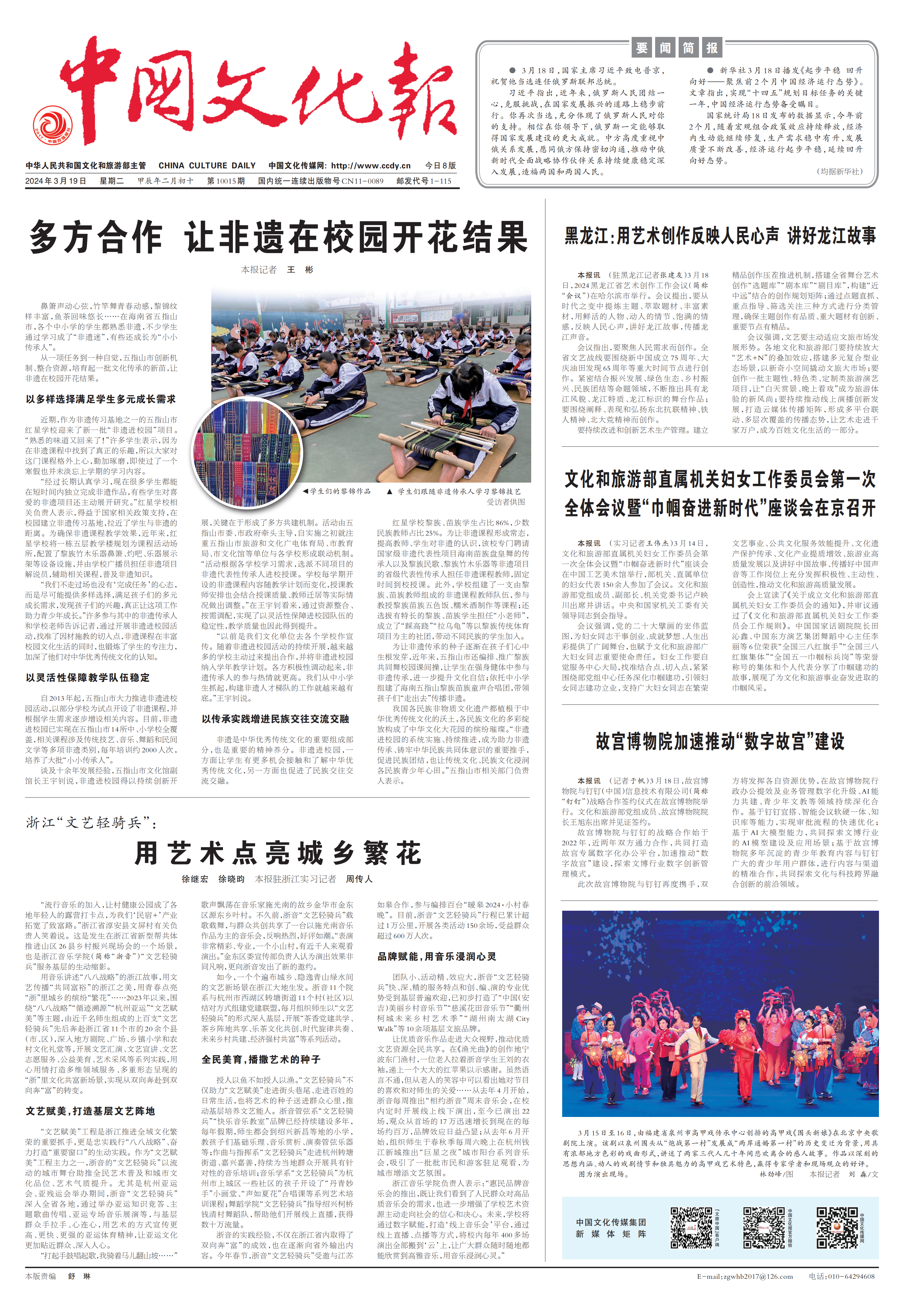 用音乐讲述“八八战略”的浙江故事,用文艺传播“共同富裕”的浙江之美,用青春点亮“浙”里城乡的缤纷“繁花”……2023年以来,围绕“八八战略”“循迹溯源”“杭州亚运”“文艺赋美”等主题,由近千名师生组成的上百支“文艺轻骑兵”先后奔赴浙江省11个市的20余个县(市、区),深入地方剧院、广场、乡镇小学和农村文化礼堂等,开展文艺汇演、文艺宣讲、文艺志愿服务、公益美育、艺术采风等系列实践,用心用情打造多维领域服务、多重形态呈现的“浙”里文化共富新场景,实现从双向奔赴到双向奔“富”的转变。