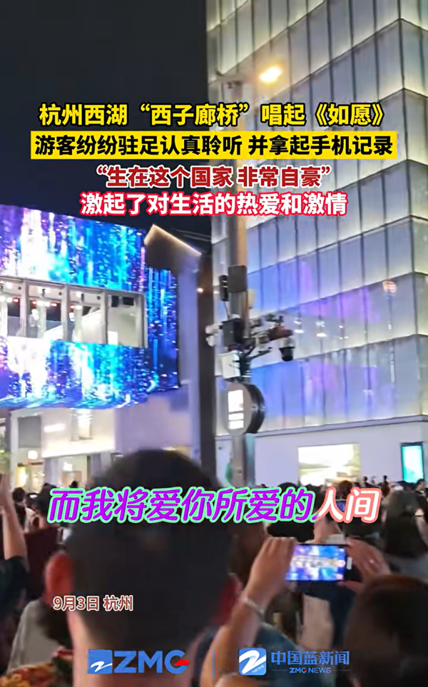 中国蓝新闻:杭州西湖“西子廊桥”唱起《如愿》,游客纷纷驻足认真聆听,并拿起手机记录。游客分享当下的心情:“生在这个国家,非常自豪,激起了对生活的热爱和激情”。