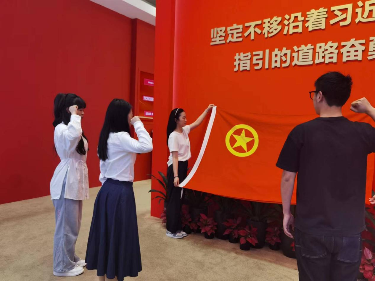 参观期间,崔洁为师生党员们上了一堂生动的党课,专题解读了习近平总书记考察浙江重要讲话精神,并要求大家把学习贯彻习近平总书记考察浙江重要讲话精神作为头等大事和首要政治任务,深刻把握精髓要义、丰富内涵和实践要求,健全落实机制,加强常态化调度、推进、督查。同时希望教师们坚持树牢“学高为师,身正为范”好榜样;同学们不断展现“品学兼修,自律自强”新风采。党员教师们围绕党课主题分享了学习体会。新团员还在展览馆大厅举行庄严的入团宣誓仪式。