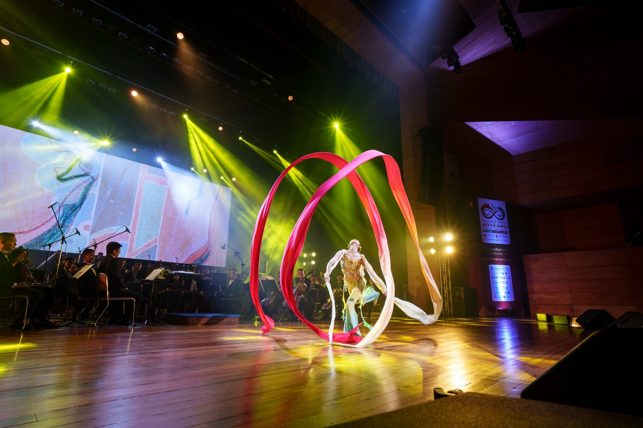 音乐会上,李跞演奏了由著名作曲家王丹红作曲的琵琶协奏曲《云想花想》,少将纳荣指挥泰国皇家海军交响乐团协奏;李秋竹表演中国古典舞《飞天》,与大屏幕展示的浙音学子音乐-绘画作品相得益彰、静动有致;交响乐团弦乐队首演了沈纳蔺为弦乐队而作的《下四川》,由画家张晓丽现场创作音乐-绘画,该同名画作赠予泰国文化部收藏。演出结束后,中泰方嘉宾上台向学院教师等表演者致谢,并互致新春祝福,祝愿两国未来更加美好、稳定、繁荣。