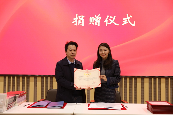 学院教师代表向浙江图书馆捐赠了由艺术指导教学部教师出版的系列书籍和音像制品。浙江图书馆毛炳聪主任代表浙图向浙音教师代表颁发了捐赠荣誉证书。