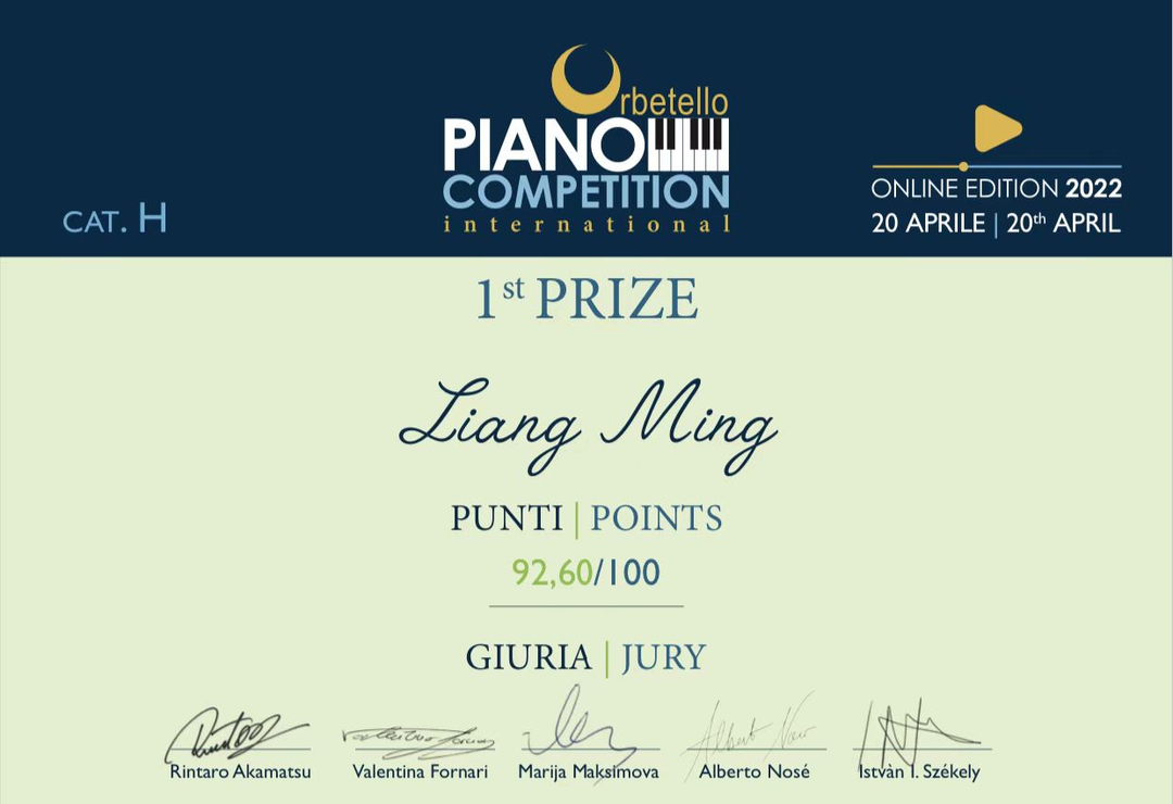 据悉,意大利奥贝雷洛国际钢琴比赛于2017年启动,比赛旨在展现来自世界各地钢琴人才的精湛技艺,第一名的选手将在意大利举办个人巡回音乐会、参与大师班,并获得免费参加其国际音乐节的资格。受疫情影响,2021年起,比赛增加在线参赛模式。今年共有来自全球的近300名青年钢琴家参与报名,经过层层选拔,共遴选出10名选手进入决赛。