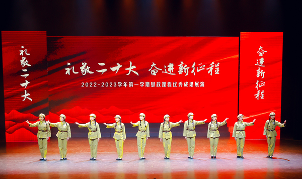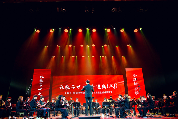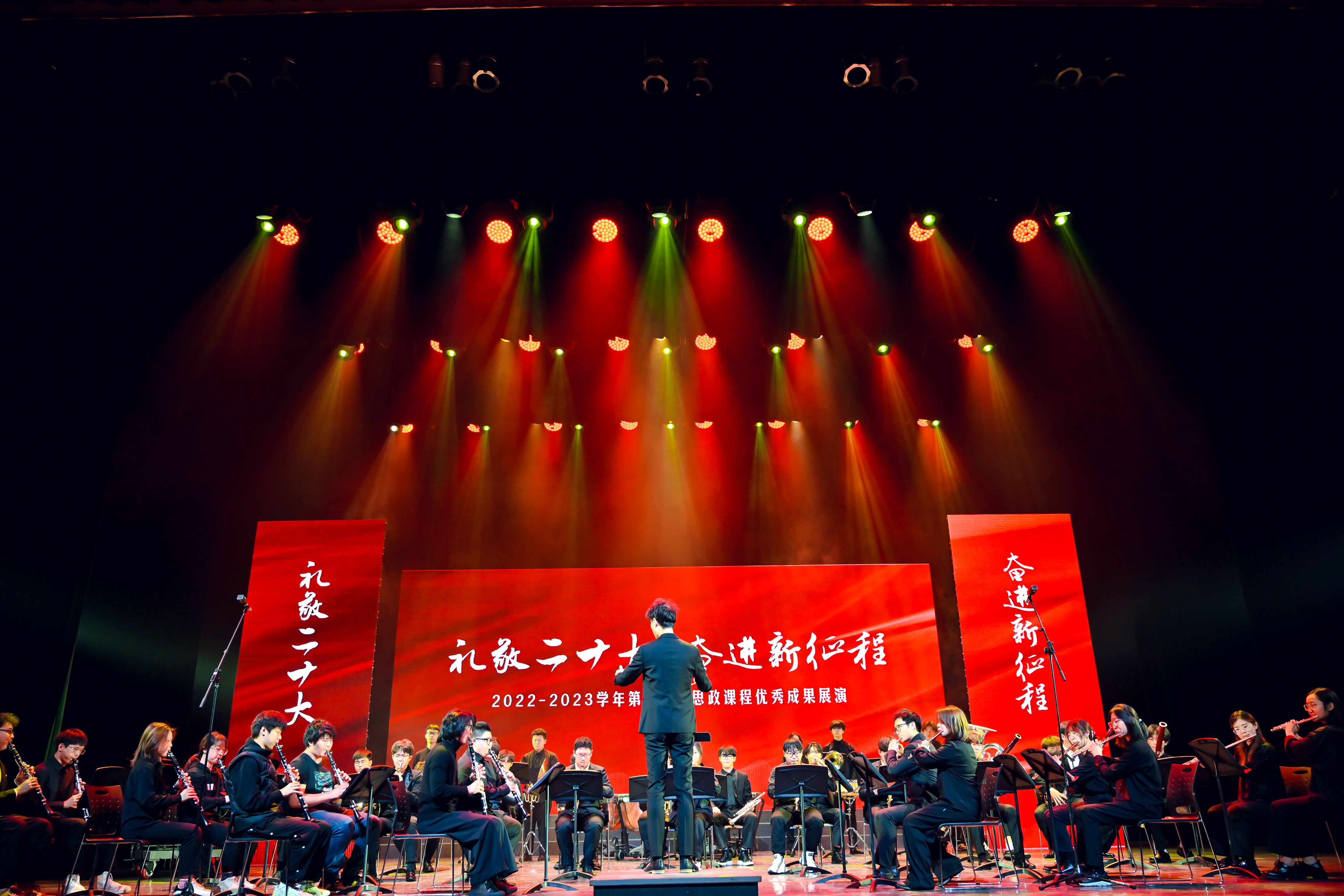此次展演是学院举办的第九场思政课程优秀成果展演。近年来,学院全面贯彻落实习近平总书记在学校思想政治理论课教师座谈会上的讲话精神,深入贯彻落实《关于加强马克思主义学院建设的实施方案》,注重思政课教学创新改革,探索出一条“思政+音乐”的特色教学之路。马克思主义学院在思政课上列出“菜单式”清单,引导学生立足课堂教学、依托课程教材、依靠专业特点,用艺术形式演绎和再现思政课程教学内容;各院系的专任教师担纲艺术指导,从专业角度确保节目的高品质和表现力;参演学生珍惜上台演出的难得机会,在课业之余认真编排节目并反复排练,深入把握节目思想内涵和角色演绎。三者的倾情投入,使思政课程优秀成果展演的思想性、教育性和艺术性得到充分彰显,让所有的参与者和观众沉浸式地接受心灵的洗礼,进一步强化了对党的热爱并焕发出奋进新时代新征程的动力和激情。作为实践教学的延伸和深化,思政课程优秀成果展演正在成为检验检阅学院大思政工作的有效方式和落实三全育人的靓丽风景。