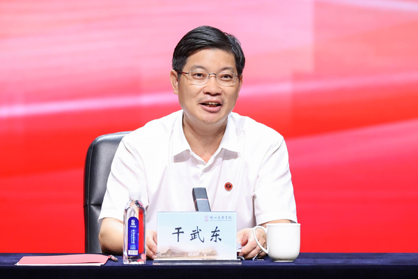 党委书记干武东在大会上作题为《振奋精神  鼓足干劲奋力开创高质量发展新格局》的讲话。干武东对暑假期间坚守奋战在各自的岗位上干部师生表示了诚挚的慰问、崇高的敬意和衷心的感谢!对扎实推进下半年工作提出了希望和要求。一是肯定成绩,振奋精神,继续保持良好发展势头。教育强国、高教强省战略以及共同富裕先行和省域现代化先行为浙音的发展提供了强劲动力和无限空间,我们要抓住机遇、增强发展动力,开放办学、激发发展活力,坚定信心、保持发展定力,“咬定青山不放松”,“不破楼兰终不还”,精准发力,推动学校持续快速健康发展。二是锚定目标,善谋实干,奋力推进“高水平一流”建设。浙音已经进入“二次发展”新征程,站在高原向高峰冲刺,接下来的路只会更加崎岖、更难攀走,更需要我们静下心来深思熟虑、科学谋划,全面加强内涵发展,持续深化创新发展,着力突显特色发展,认认真真下好每一手,踏踏实实迈好每一步,日积月累、厚积薄发,直至最终登顶山峰、精彩蝶变。三是党建引领,多元共治,凝聚高质量发展合力。全校上下要迅速行动起来,以党建为统领,践行“弘毅尚德、博约精艺”价值理念,充分发挥示范表率,着力提升服务保障水平,切实加强协同协作,心往一处想、劲往一处使、拧成一股绳,实干争先、实干创优,强力推进学校各项事业,奋力在“高水平一流”发展新征程上取得新的突破和新的跨越。