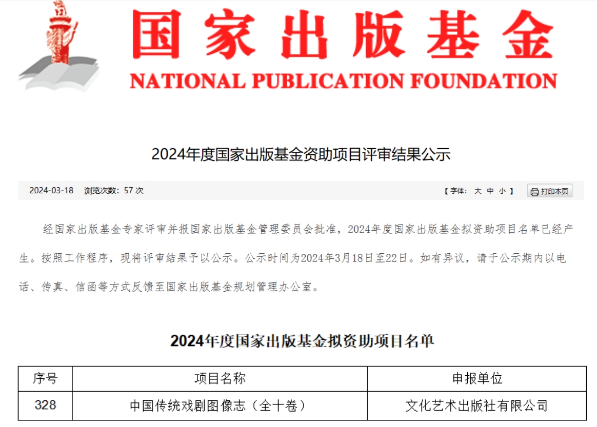 近日,国家出版基金规划管理办公室公布了2024年度国家出版基金资助项目名单,由我校戏剧学研究所刘文峰主编、安怡副主编,文化艺术出版社报送的《中国传统戏剧图像志》(全十卷)成功入选。这是该丛书继入选“十四五”国家重点出版规划后,又一次被列入国家级出版资助项目。