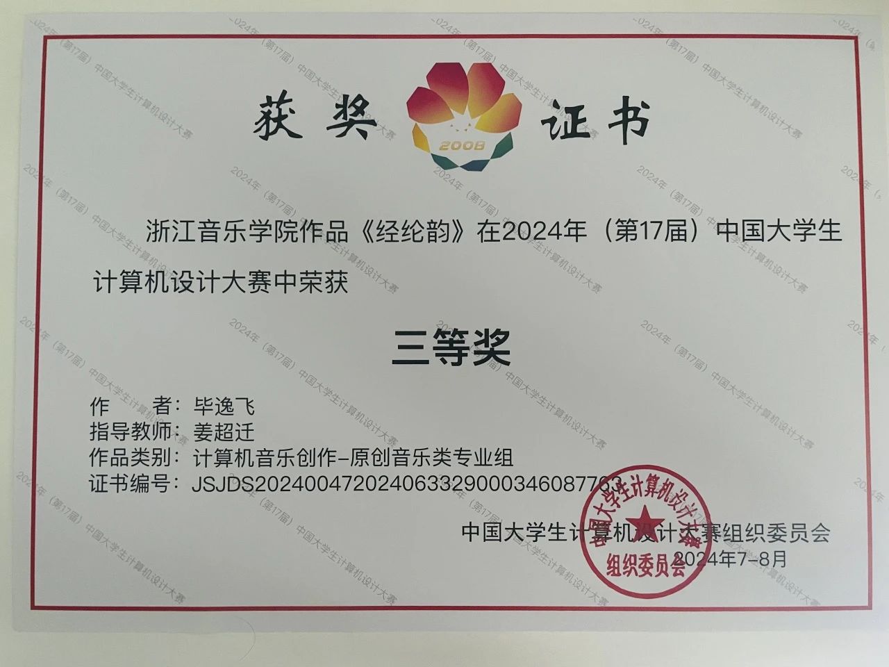 近日,2024年(第17届)中国大学生计算机设计大赛“信息可视化设计/计算机音乐创作”赛道决赛圆满落幕。经过激烈角逐,学校学生凭借扎实的专业知识、创新的思维能力和精湛的实践技能,在全国众多优秀作品中脱颖而出。其中,2021级艺术与科技学生乔汉英交互音乐作品《相生》荣获一等奖(指导老师:李秋筱、王新宇),2022级音乐设计与制作学生刘储贤、蒋正一原创歌曲作品《算学》荣获二等奖(指导老师:李秋筱),2020级音乐设计与制作专业学生毕逸飞原创音乐作品《经纶韵》荣获三等奖(指导老师:姜超迁)。