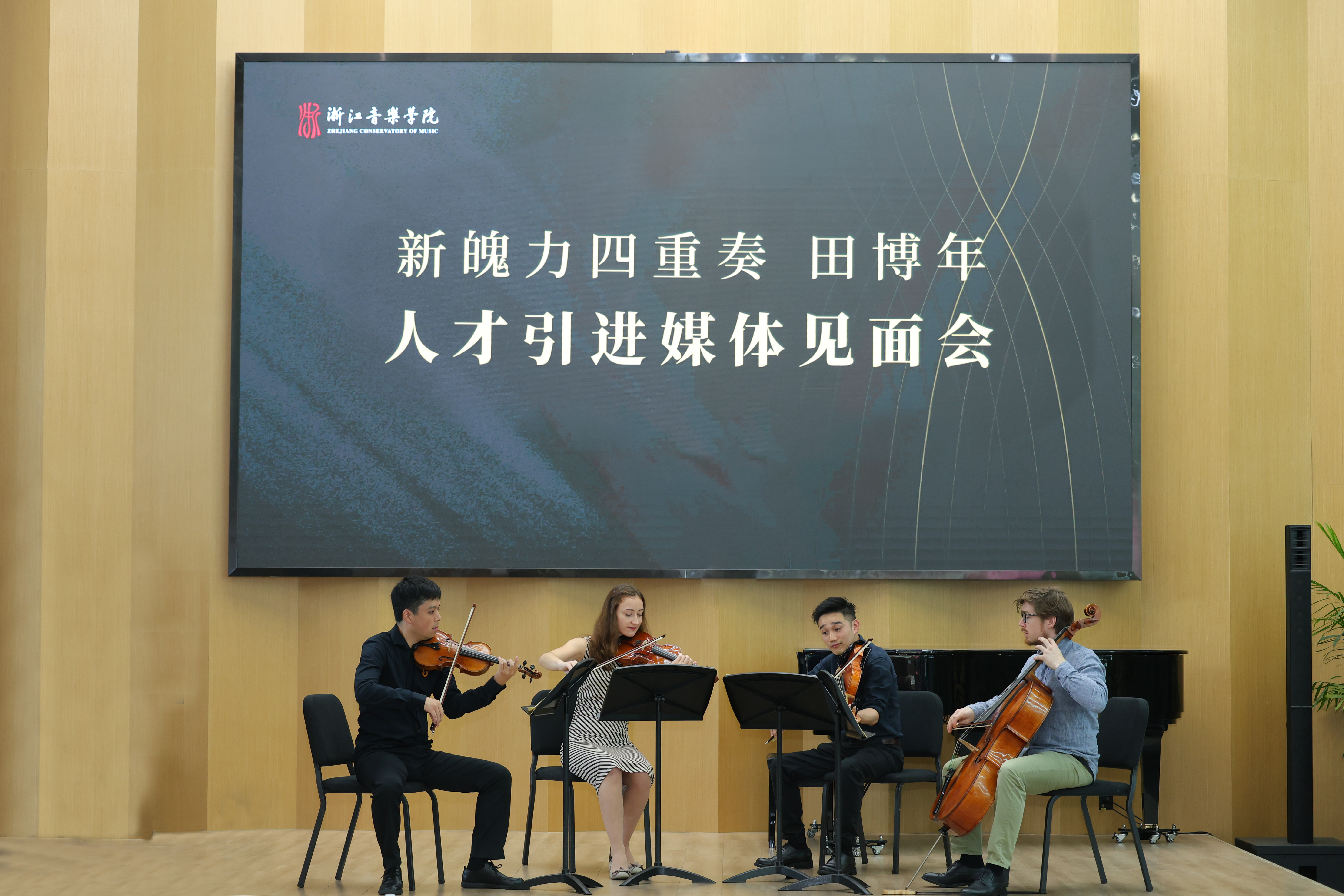清风徐来,秋色连波,“人才强校”乐章再次奏响。9月19日上午,新魄力四重奏组合、田博年人才引进媒体见面会在教师发展中心举行。院长王瑞,党委副书记蔡亦军,副院长董德君,党委委员、组织部部长、人才办主任李俊,党委委员、宣传部部长施莹出席媒体见面会。新魄力四重奏组合成员申丹枫、Antonia Rankersberger、吕翔、Ivan Valentin Hollup Roald和田博年,新华社、中国文化报、浙江日报、潮新闻、中国教育在线等国家级、省市级主流媒体代表以及师生代表参加活动。