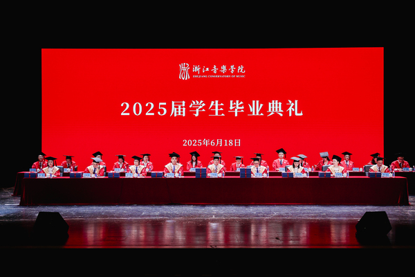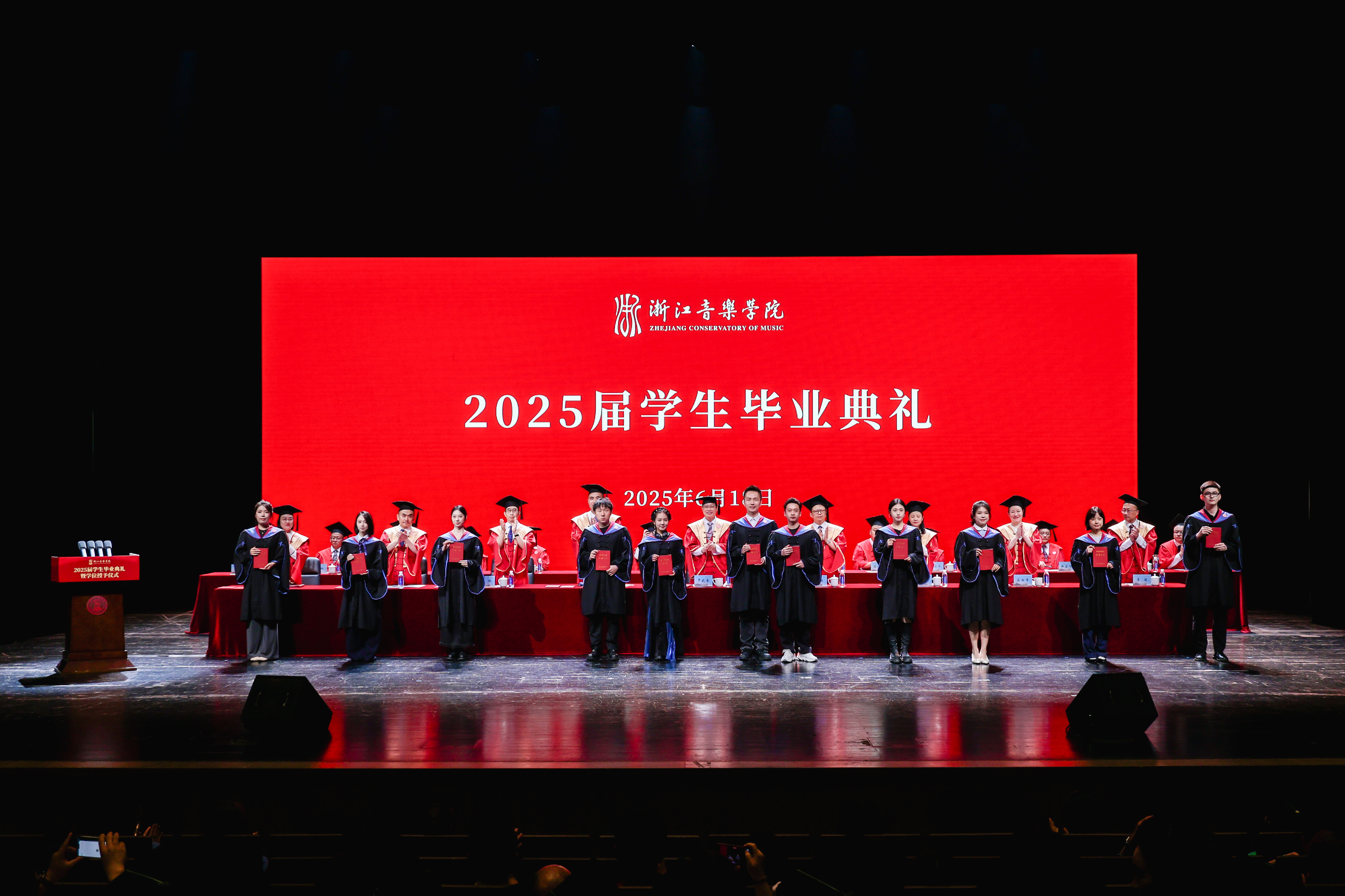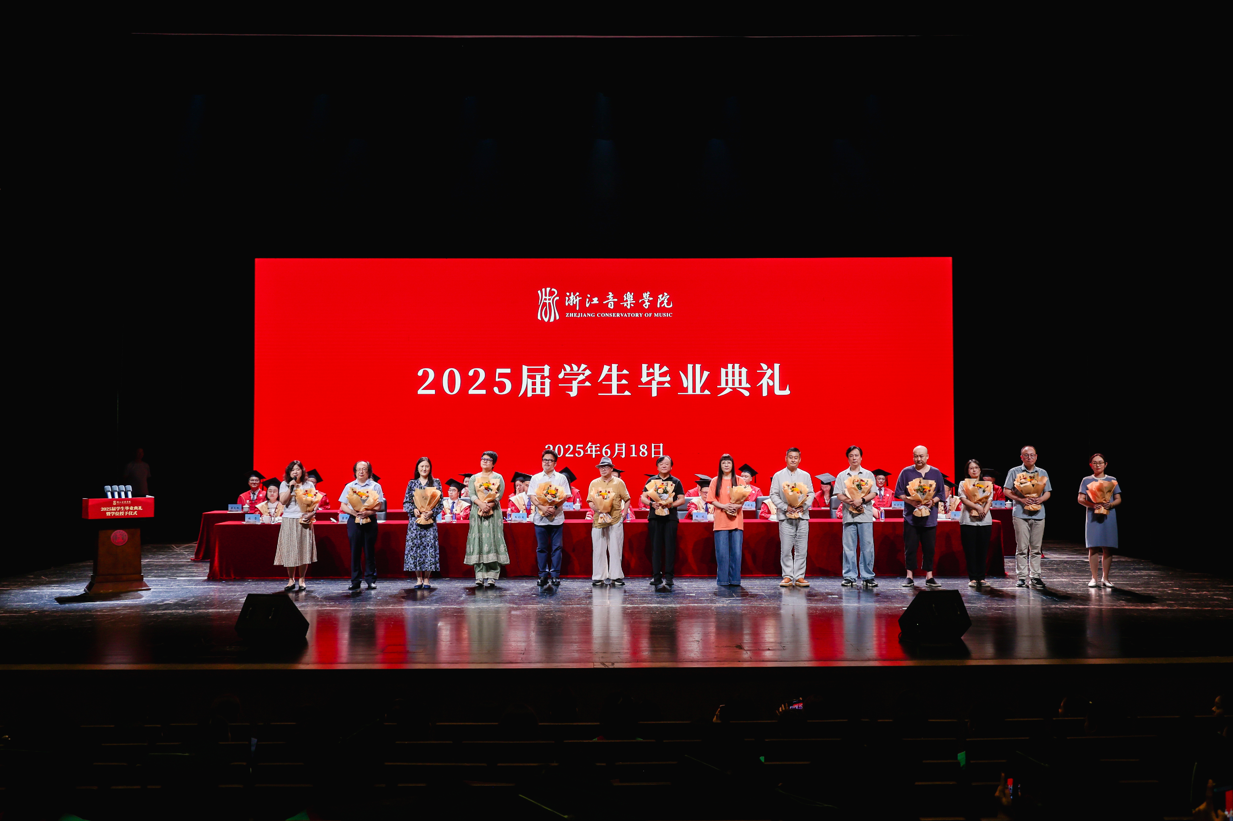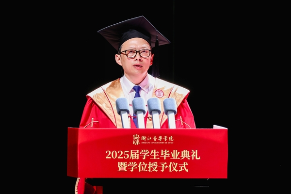 钢琴系徐洁代表教师发言,她细数四载春秋里与浙音学子们朝夕相处的动人点滴,希望同学们擎理想、守责任、融热爱、持坚韧、秉创新、倾真诚、怀感恩,带着“弘毅、尚德、博约、精艺”的浙音精神,在人生海洋中乘风破浪。艺术与文化管理高等研究院刘雨欣、舞蹈学院余晨晞分别作为研究生、本科生毕业生代表上台发言,她们用诗意的语言表达对母校的缱绻深情,并表示将以“弄潮儿”的姿态继续谱写青春华章。作曲与指挥系毕业生单未繁作为校友代表分享自己毕业后的追梦故事,并为全体毕业生送上最衷心的祝福。