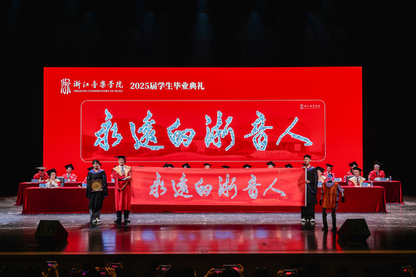 党委书记干武东向毕业生赠予亲笔题写的“永远的浙音人”纪念盘,并代表学院接受毕业生赠送的卷轴。这幅卷轴别出心裁地将全体2025届毕业生的照片巧妙拼组成“永远的浙音人”的艺术字样,既是毕业生对母校培育之恩的深情致谢,也展现了他们将以“永远的浙音人”这一崭新身份扬帆起航、追逐梦想的坚定决心。