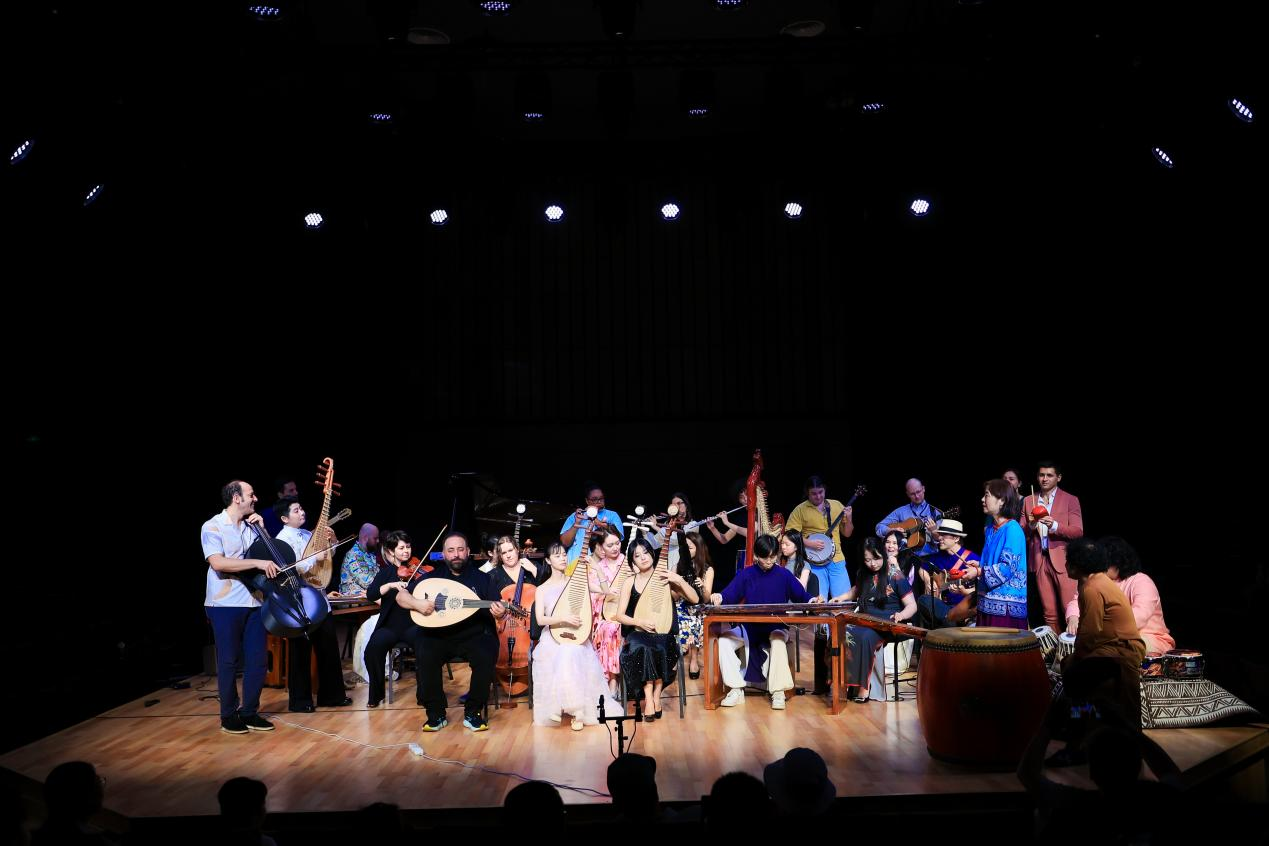 第二、三场音乐会中,音乐家与音乐爱好者学员们共同演出。音乐爱好者们分为三组,在音乐家的指导下排练并演绎了《老六板》《To Paradise》《Chasing Fireflies》《虞美人》《Nirvana》《浣溪沙》等曲目。其中由小娟&小强指导演奏的《浣溪沙》,不仅饱含中国传统音乐元素,还融入了美国学员的音乐创作想法,整首乐曲获全场欢呼。音乐会上,东西方乐器交融,传统与现代碰撞,展现出丝路音乐文化的广阔包容性与创新活力。最后,全体合奏中国民歌《四季调》、美国传统歌曲《Shove the Pig’s Foot a Little Further into the Fire》以及具有浓郁中国特色的《秧歌》。台上台下默契互动,不同文化背景的音乐人因音乐而共鸣,生动诠释了“各美其美、美美与共”的深刻理念。
