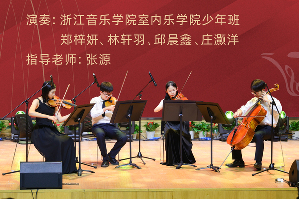 仪式现场,附中学子带来精彩的教学成果展演《最美附中》,表达对新校区启用的喜悦和对学校未来发展的美好憧憬。作品涵盖国乐合奏《卧虎藏龙》、中国舞群舞《小卜少》、弦乐四重奏莫扎特《G大调弦乐四重奏“春天”》第四乐章、现代芭蕾三人舞《十四行诗》、吹打乐合奏《龙腾虎跃》,琴声悠扬、舞姿翩然,尽显艺术教育的丰硕成果。